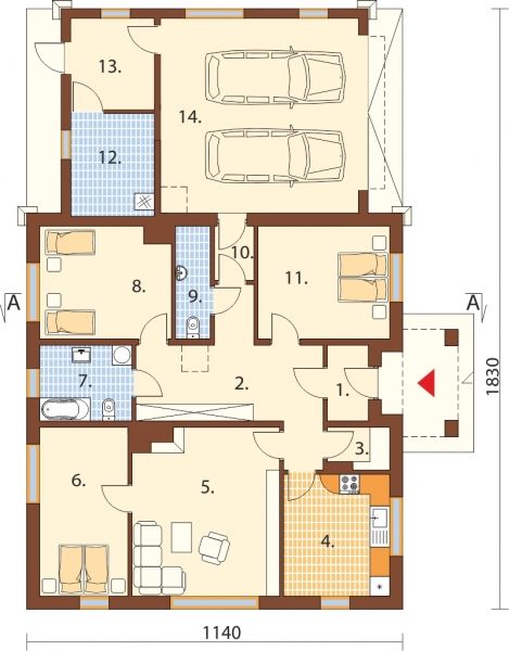 Проект "АБ - 2738" - хороший одноэтажный дом для постоянного проживания из арболитовых блоков с гаражом. Площадь гаража 194.00 м2 с размерами 11 на 18.
